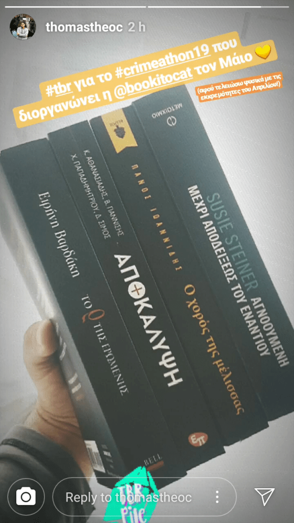Λοιπόν, για να μην μας πάρουν τα ζουμιά θα σας πω πως θα λειτουργήσει όλο αυτό το εγχείρημα. Πρώτα θα σας πω το tbr μου, μήπως σας δώσω και ιδέες. Στην συνέχεια θα σας πω για τα βιβλία που θα ήθελα να διαβάσω άμα βρω χρόνο και τέλος θα δούμε κάποιες από τις δικές σας εικόνες. Για τις υπόλοιπες εβδομάδες θα έχουμε τα λεγόμενα «Reading Blogs», στα οποία θα καταγράφω το πως πάει ο μαραθώνιος, αλλά και θα συζητάμε μαζί για τα δικά σας αναγνώσματα. Στο τέλος κάθε «Reading Blog» θα έχουμε τις δικές σας καινούργιες φωτογραφίες. Άμα θέλετε να βρεθείτε και εσείς σε αυτήν την θέση, το μόνο που έχετε να κάνετε είναι να βάλετε στο instagram το tag #crimeathon2019.
