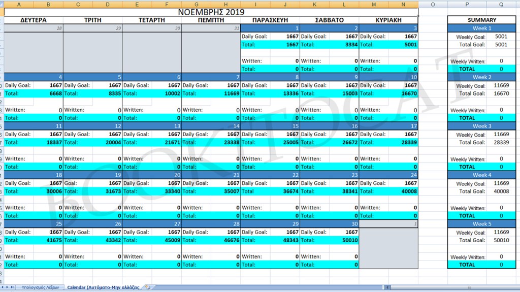 Έτσι, βάζοντας να μου υπολογίζει αυτόματα το σύνολο, το μόνο που έχω να κάνω είναι κάθε μέρα να μπαίνω και να συμπληρώνω πόσες λέξεις έγραψα. Ταυτόχρονα, μου αφαιρεί το ημερήσιο ποσό από το συνολικό ανά γραμμή ώστε στην ημέρα 30 να έχω «Μένουν Ακόμα= 0» ή ακόμα καλύτερα μείον ποσοστό.