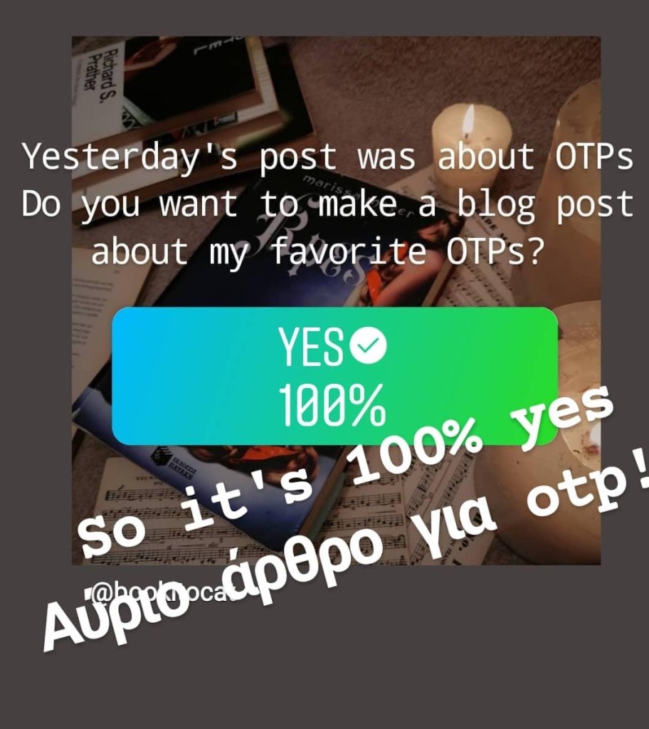 Η Ιδέα προήρθε από την φωτογραφική πρόκληση της Εύα (@ikaria_books_and_chocolate) που μου έλεγε να ανεβάσω το βιβλίο με το αγαπημένο μου ζευγαράκι και καθώς το μυαλό μου μπλόκαρε εντελώς μένοντας να κοιτάζει μόνο την σειρά The Lunar Chronicles αναρωτιόμουν εάν όντως έχω αγαπημένα ζευγάρια. Μετά από μια κρίση ταυτότητας, δέκα ερωτήσεις στον εαυτό μου, τρεις επικλήσεις στον φιλικό δαίμονα που κάποτε έμενε στην πολυκατοικία μου και διαβάζοντας τα σχόλια σας στην ανάρτηση, θυμήθηκα ότι λατρεύω και άλλα ζευγάρια. Έτσι σας ανέβασα στην ιστορία μου σαν καλή influencer (μην τον σχολιάσετε ήδη ξέρασα λίγο στο στόμα μου) εάν θέλετε ένα ολόκληρο άρθρο με την λίστα μου.